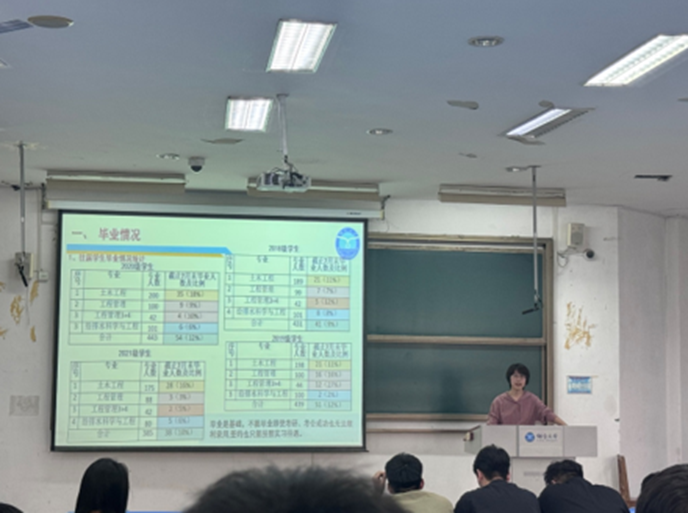 会上,于笑老师结合学院往届毕业生的详实数据,进行了多维度、深层次的剖析。她详细介绍了近几届学生的毕业情况、考研与考公情况,为同学们提供了极具参考价值的信息。此外,她还就校园宣讲会、企业招聘节奏等情况进行了说明,提醒同学们要密切关注学校就业信息网,积极参与各类招聘活动,提前积累求职经验。于笑老师强调,面对日益严峻的就业形势,同学们必须树立“主动出击”的意识。她建议同学们要科学自我评估,结合自身兴趣、能力与职业理想,合理选择考研、考公或直接就业等不同路径,同时要做好求职准备,锻炼求职技能,为接下来来的招聘打下坚实基础。