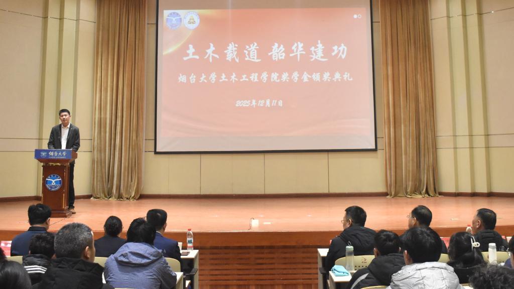 在致道厅举行2025年“土木载道,韶华建功”奖学金颁奖典礼暨第二届构造节开幕仪式。荣华建设集团有限公司副总裁董建明、山东意林建筑规划设计研究院有限公司执行董事兼总经理马建刚,烟台飞龙集团有限公司党委副书记吕昌梅,柠檬直播